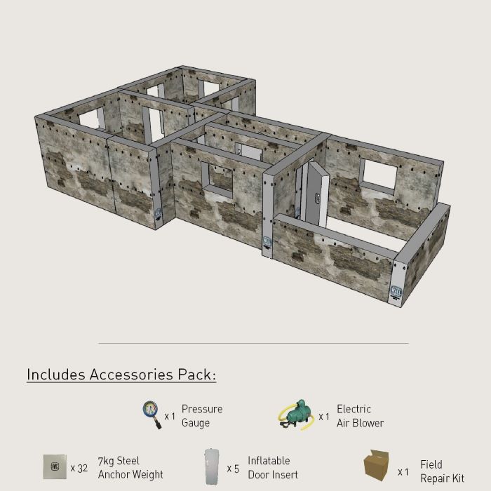 The 16-Wall System Inflatable Shoot House offers a range of inflatable walls to create an instant urban setup for small-scale training for 1-6 trainees.
